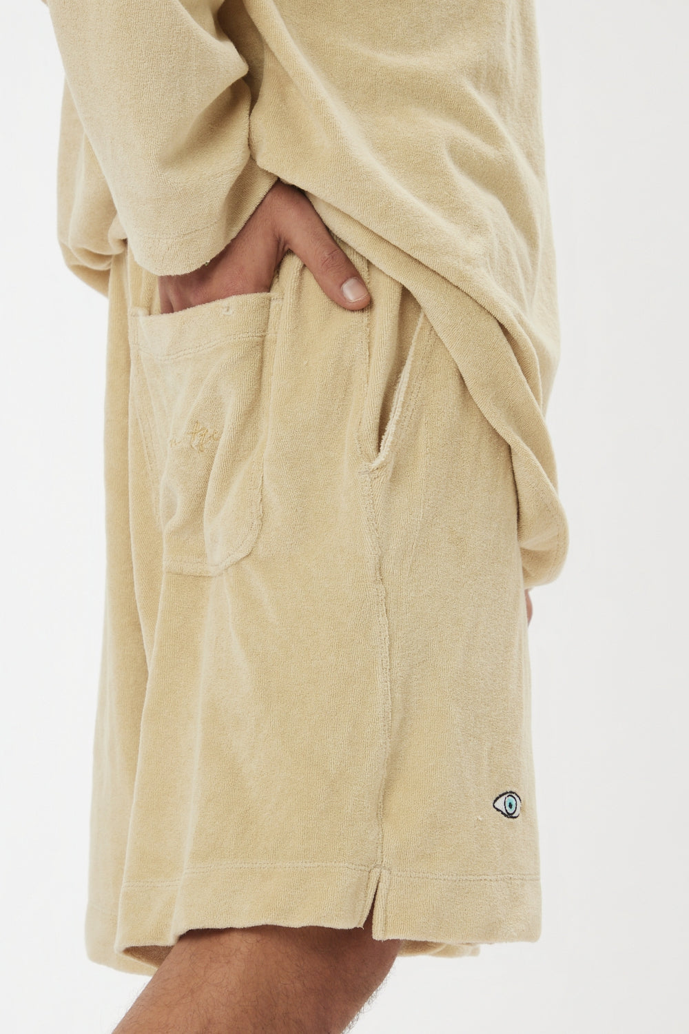 Features raw-edge finishing, a branded drawstring, and an embroidered eye detail on the front.