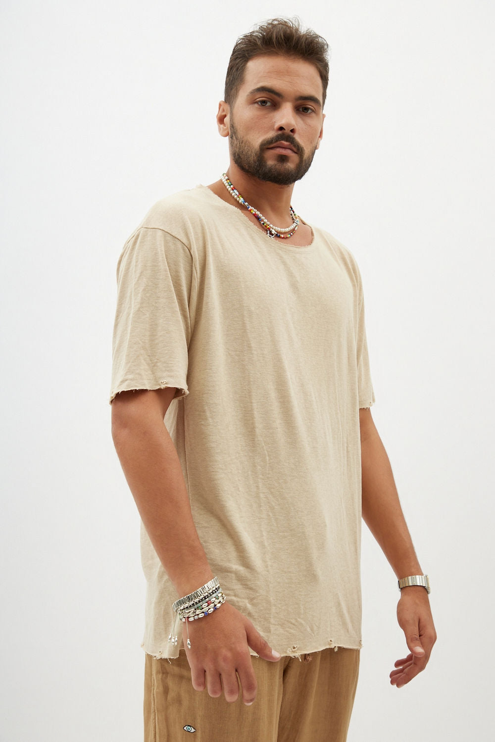 Made from an ultra-soft fabric, short sleeves, featuring an open “Nicki” cut with a ripped-look finish and eye embroidery on the back.